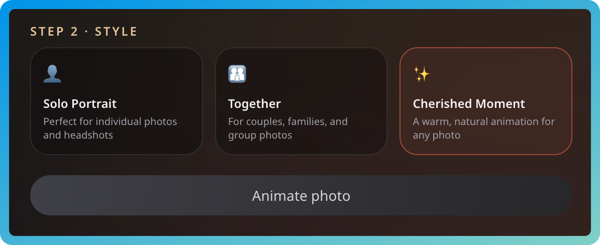 Solo Portrait works best for one person, focusing on smile, expression, and head movement. Together is for two or more people and creates natural interaction. Cherished Moment is a warm, all-purpose style for any photo.